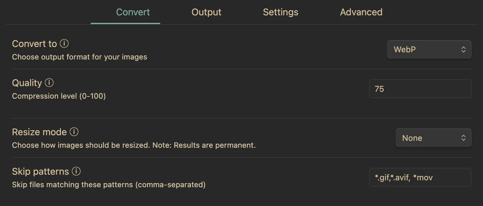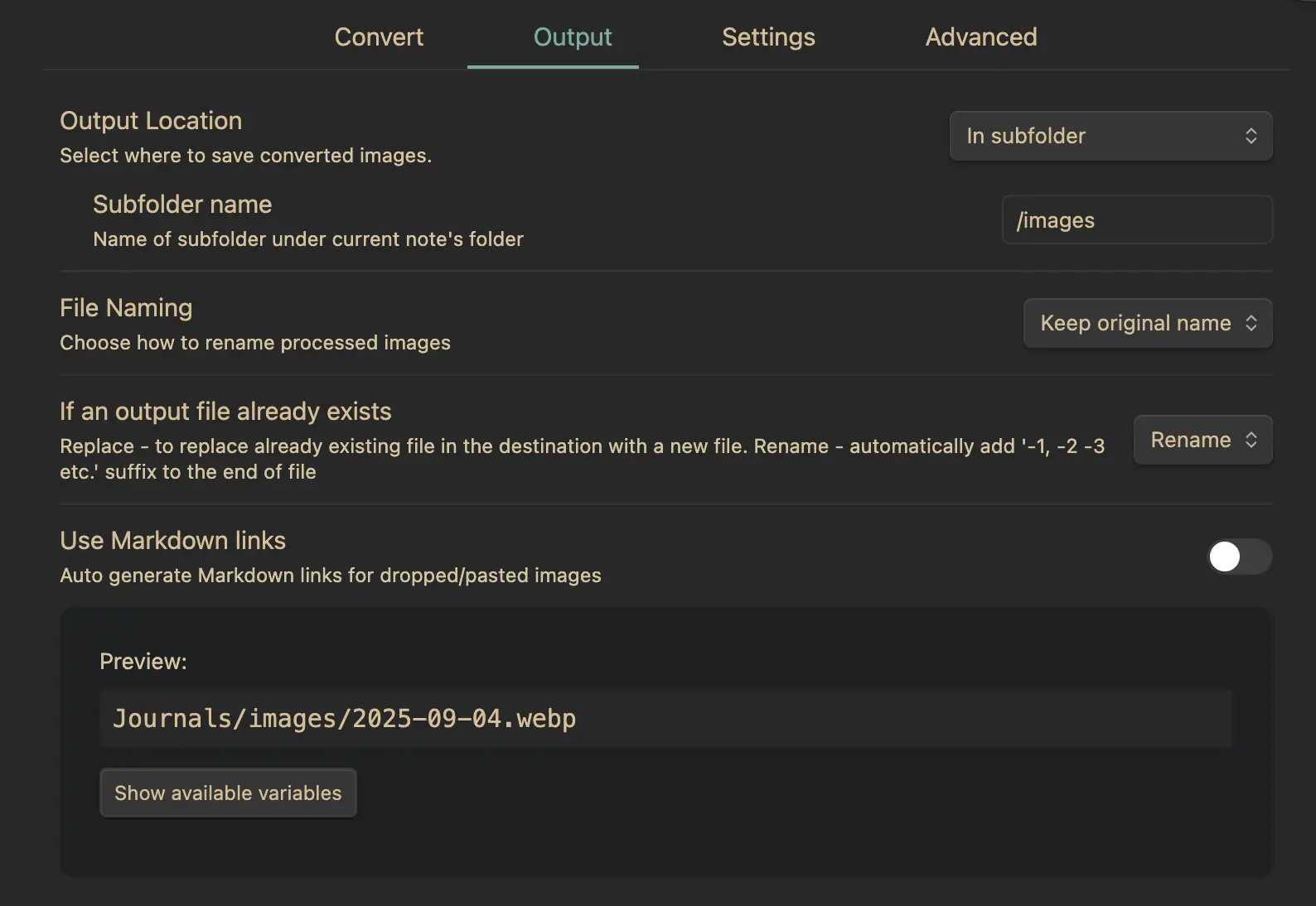 Does what it saids and easy to use. When dragging an image to a note, it automatically covert the image to WebP without deleting or adding the original.